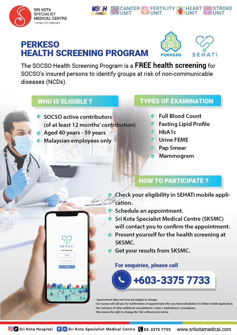 The Perkeso (SOCSO) Health Screening Program is a free health screening for SOCSO’s insured persons to identify groups at risk of non-communicable diseases (NCDs).