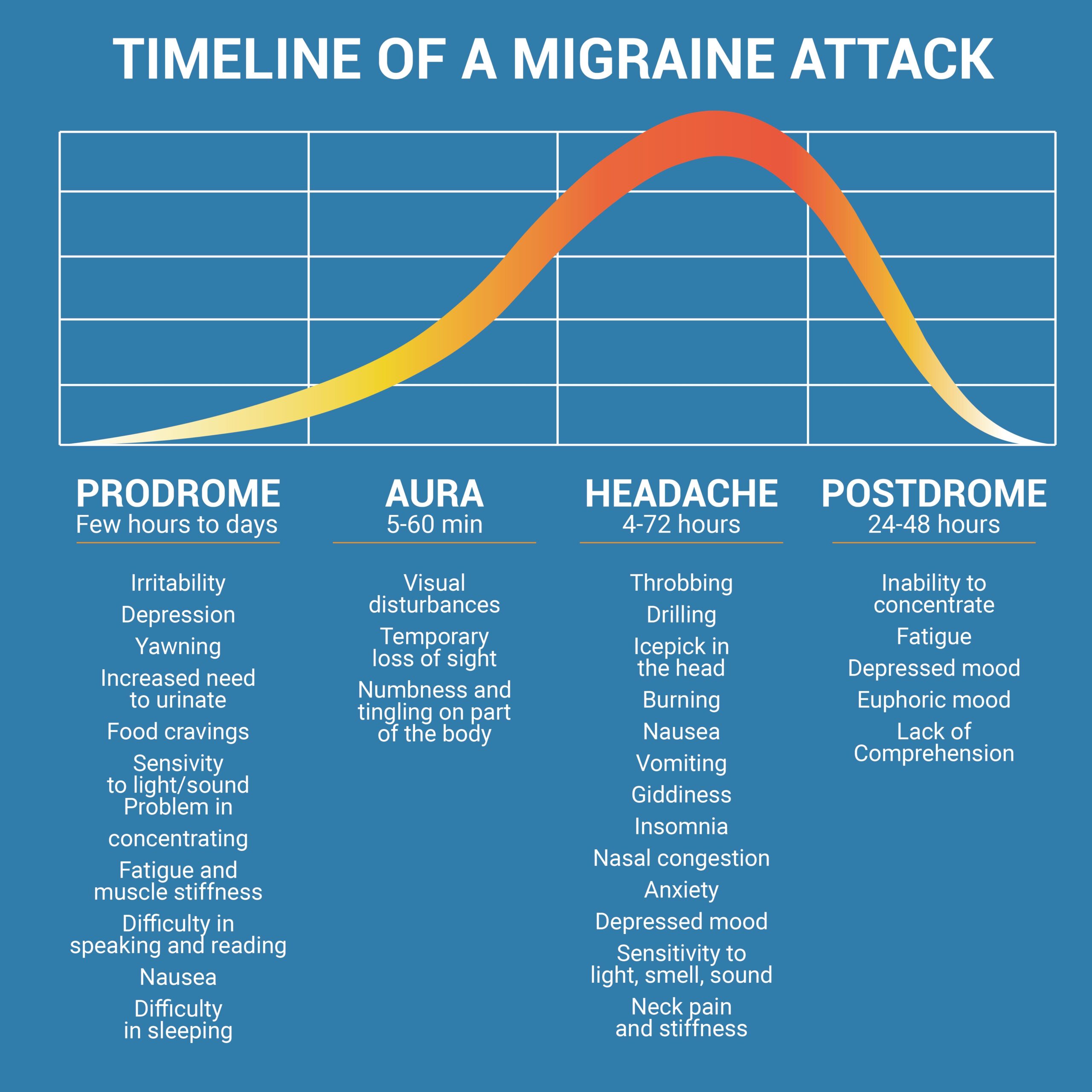 Many people start having symptoms 24 to 48 hours before a migraine headache comes on. These may include increased yawning, a feeling of euphoria, depression, irritability, food cravings, constipation, and neck stiffness.
